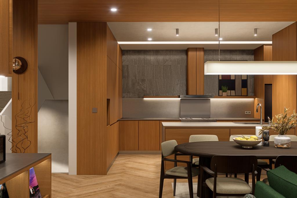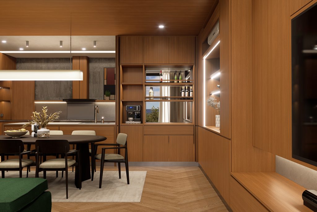 Adanya niche (ceruk) kayu dengan pencahayaan khusus yang memajang koleksi KAWS figures dan turntable memberikan narasi pribadi pemiliknya.