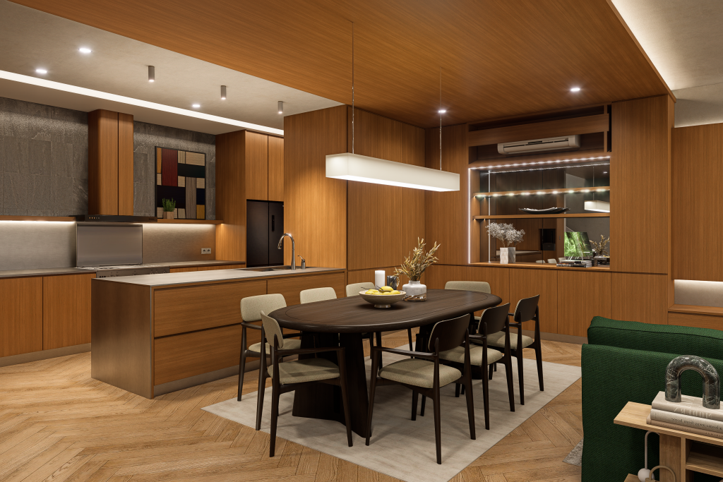 Desain ini adalah antitesis dari kemewahan yang “dingin”. Konsep utamanya adalah menciptakan keseimbangan antara kekakuan arsitektural dengan kelembutan hunian. Ini adalah ruang yang dirancang untuk “memeluk” penghuninya setelah seharian berada di luar yang bising.