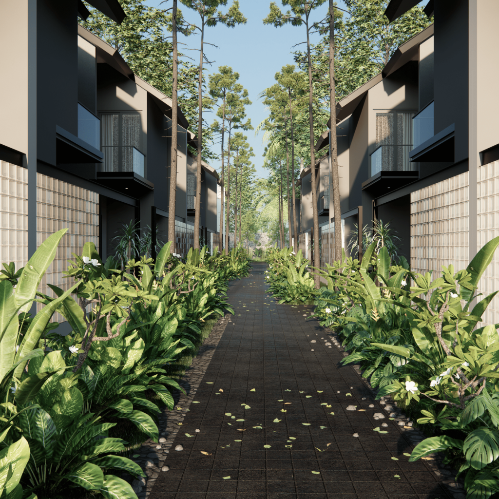 In the site plan, we made a rule that every 2 house (mirrored couple mass), should have offset not only from the street, but also from the side and the back. Creating alleys and green spaces for people to have in their surroundings. This is an investment that we push to make, that could added multiple value to every house in this cluster.