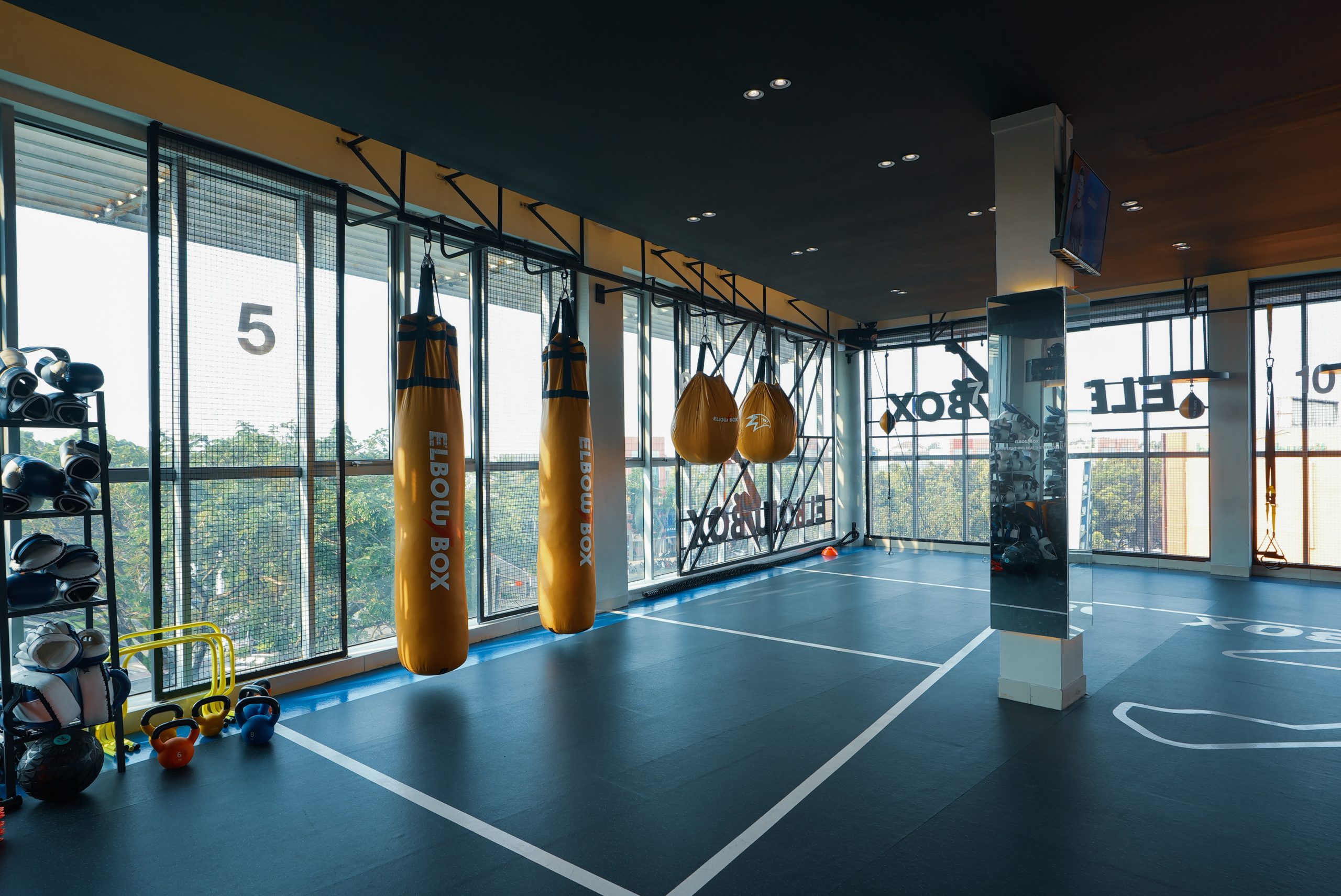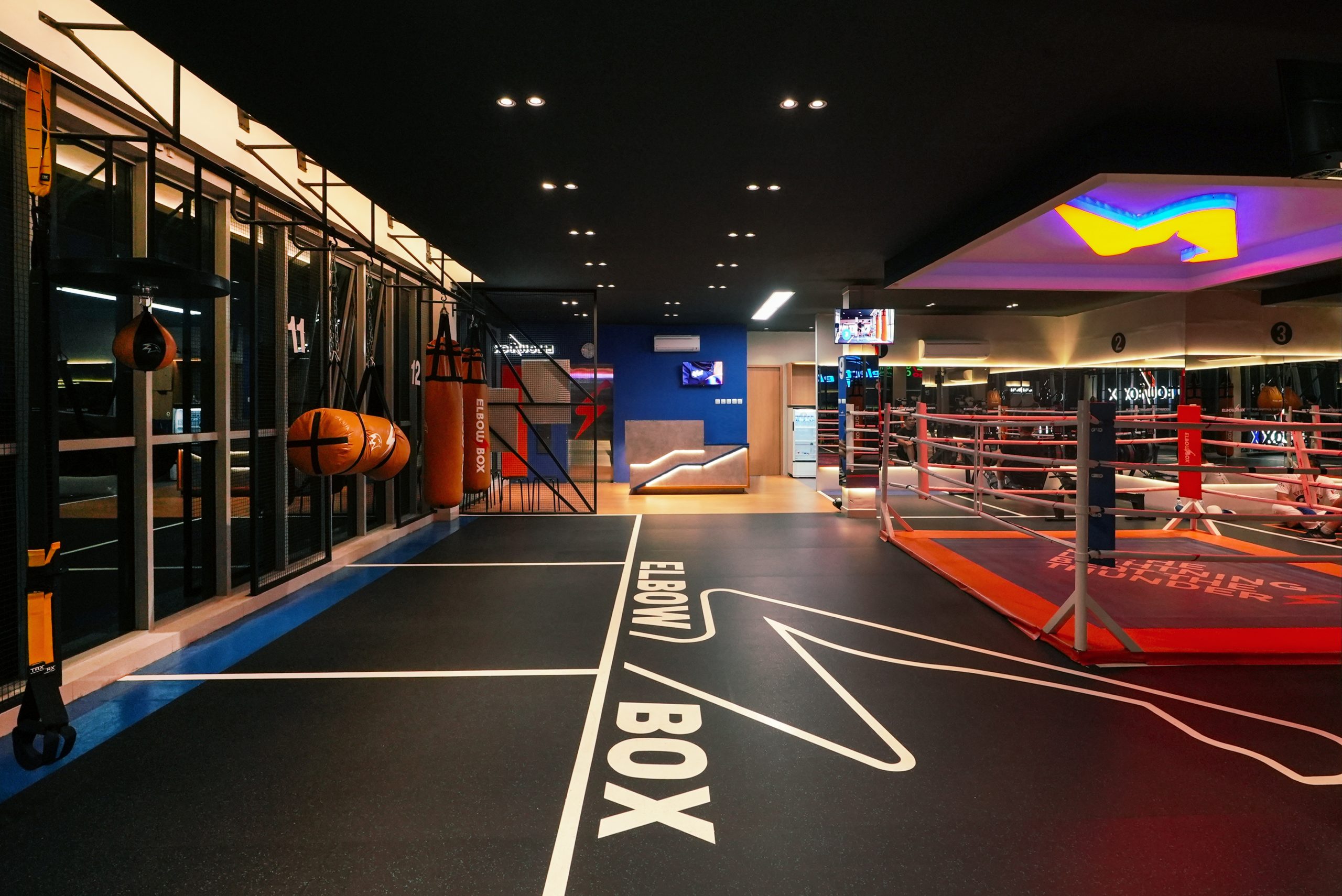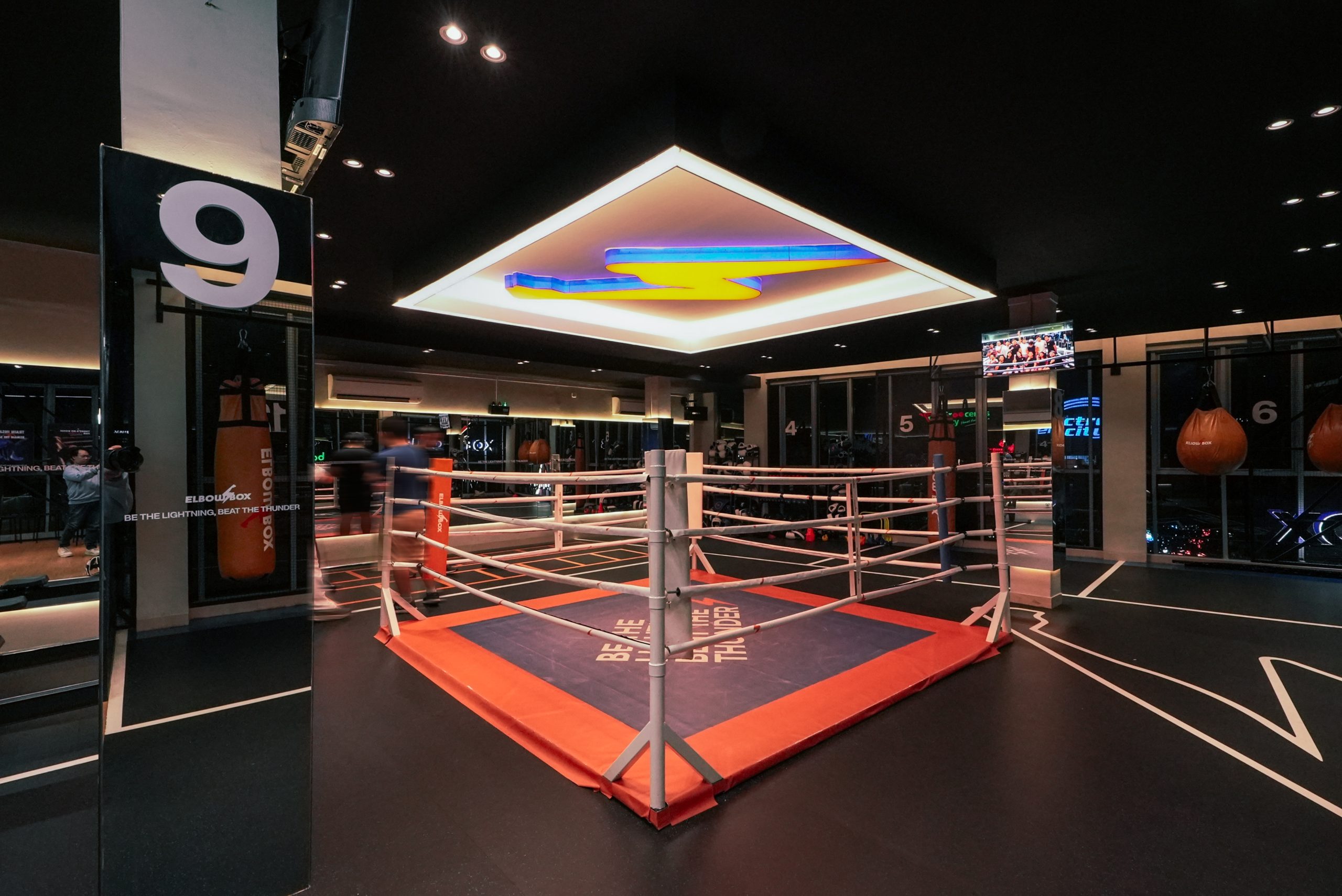 The layout is arranged that all 12 rounds could have sufficient space for 2 persons at one time. The iconic boxing arena with accent ceiling light, bring out the boxing arena as the center of attention.