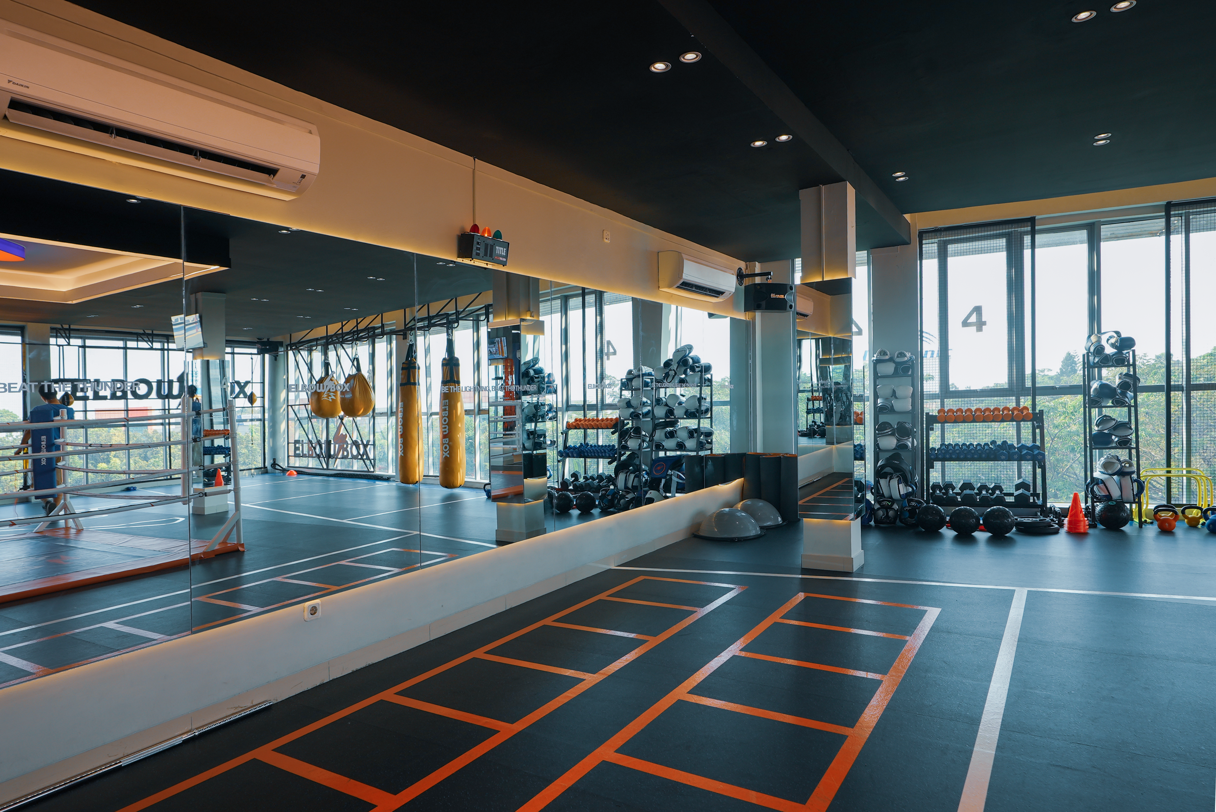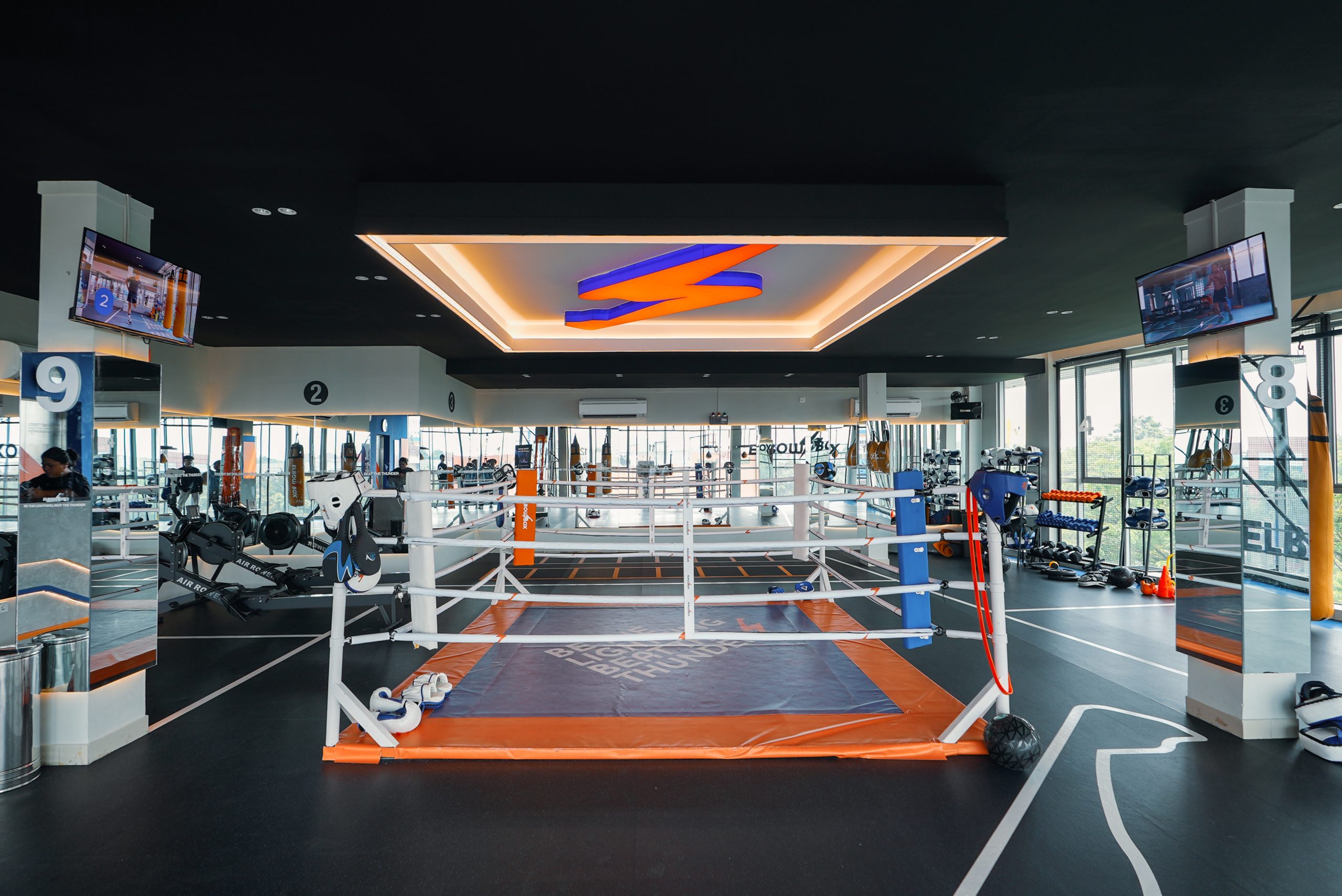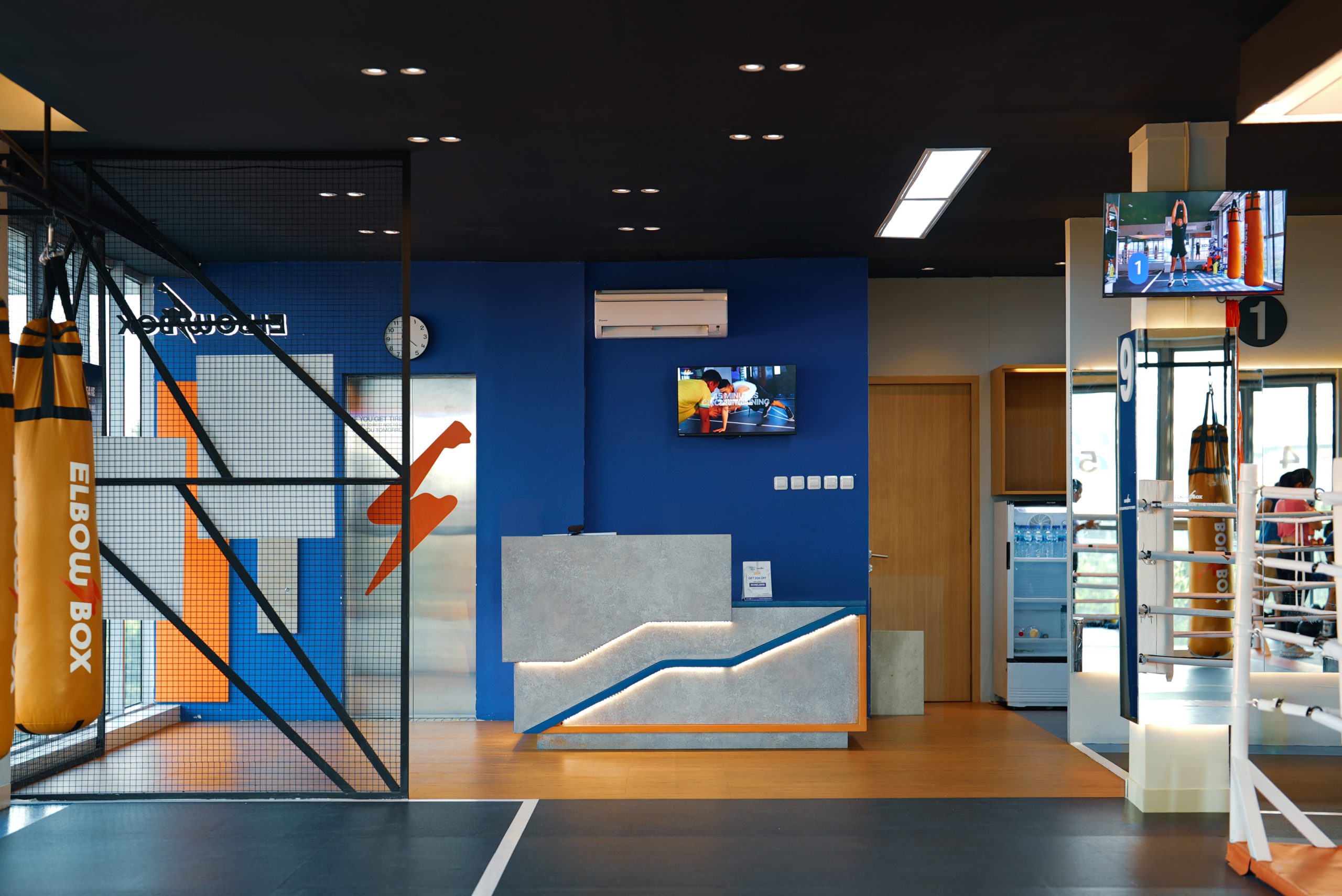 The layout is arranged that all 12 rounds could have sufficient space for 2 persons at one time. The iconic boxing arena with accent ceiling light, bring out the boxing arena as the center of attention.