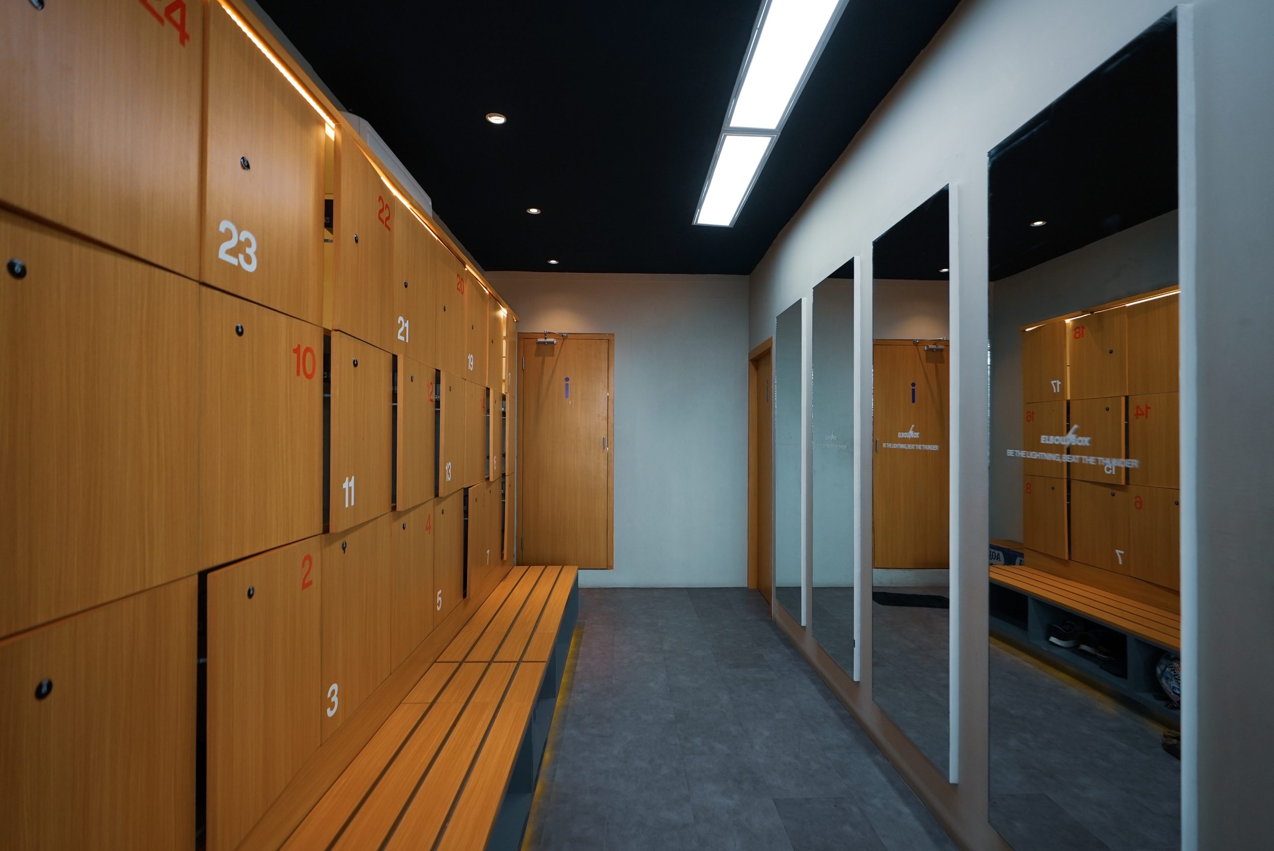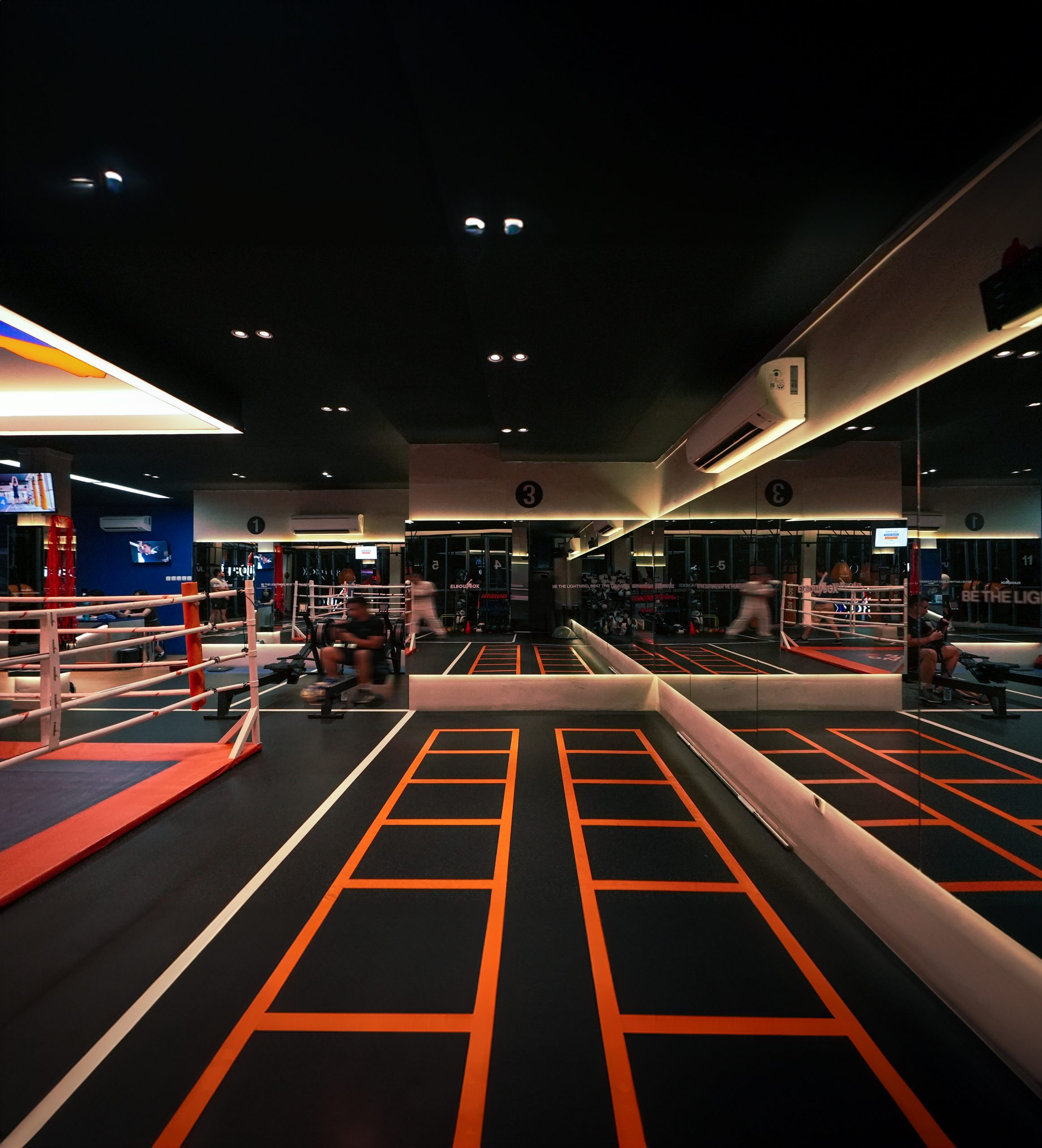 Mirror is essential in this gym space. All walls are covered in mirror, with backlight giving soft comfortable ambience. The ceiling and floor are kept dark, to really highlight the people and activity as the focus in the space.